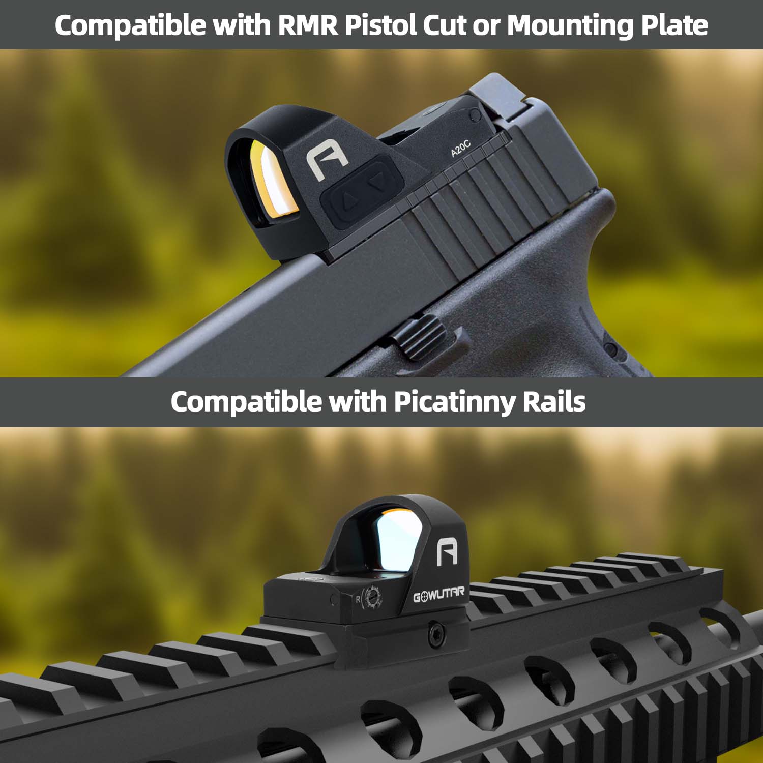 A20C multi-reticle red dot sight is compatible with RMR cut slide or mounting plate, suitable for most optic-ready pistols and handguns (The same base as Trijicon RMR/SRO & Holosun 407C/507C/508T).
